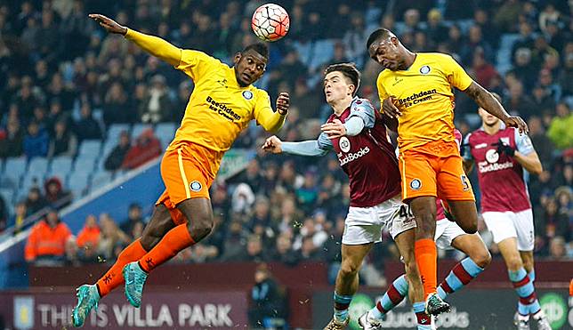 Pemain Aston Villa, Jack Grealish (tengah) berebut bola dengan dua pemain Wycombe Wanderes, Anthony Stewart dan Aaron Pierre, pada laga babak ketigaPiala FA di Stadion Villa Park, Birmingham, 20 Januari 2016.