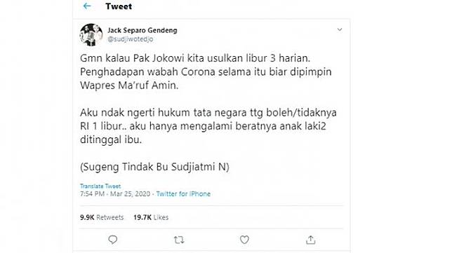 "Gimana kalau Pak Jokowi usulkan libur 3 harian. Penghadapan wabah corona selama itu biar dipimpin Wapres Ma'ruf Amin," tulis Sudjiwo Tedjo.