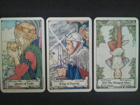 Leo – Queen of Cups, King of Swords, Hanged Man