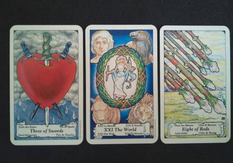 Aries – Three of Swords, The World, Eight of Rods