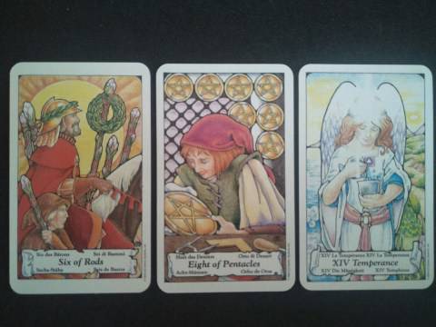 Virgo – Six of Rods, Eight of Pentacles, Temperance