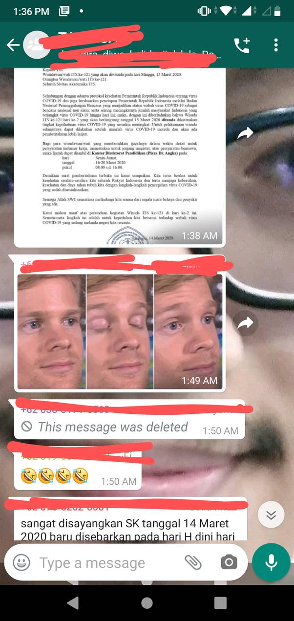 Wisuda saya dibatalkan jam-6. Iya, jam-6, bukan h-6 ya hahaha. Pengumuman tersebut baru di sebar di grup whatsapp pukul dini hari (saya tidak tau pasti, tapi berhubung saya bangun pukul 2.30, pengumuman itu sudah ada). Saya bangun dengan perasaan girang, namun langsung down membaca pengumuman tersebut. Saya tidak tega membangunkan mama saya yang paling getol mengingatkan untuk pasang alarm agar saya dapat bangun pukul 3 pagi untuk bersiap2. Kami tidak menyewa makeup artist, karena sehari sebelumnya saya berhasil membuktikan ke mama (yang ngotot mau nyewa jasa mua) kalau hasil makeupan saya tidak terlalu buruk dibandingkan dengan mua. Mama saya sampai minta di makeupin saya bahkan hehe.
