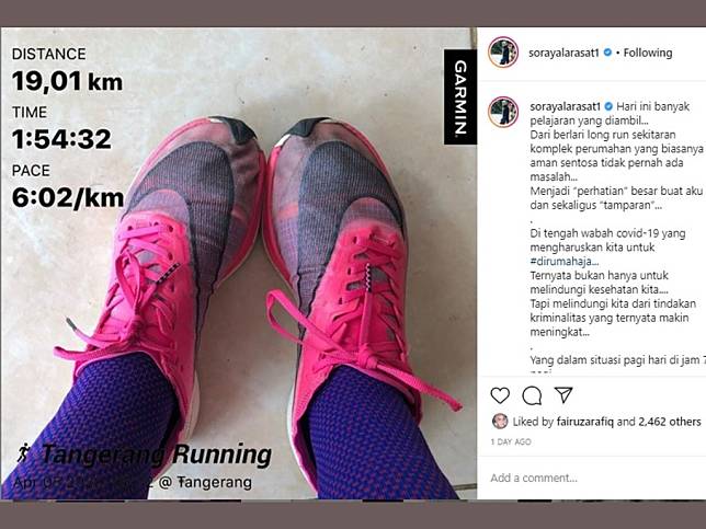 Hal itu disampaikan Soraya melalui akun Instagram miliknya dengan membagikan foto sepasang kaki yang ditutupi sepatu lari berwarna pink. Lewat keterangan unggahan pada Minggu, 5 April 2020 tersebut, bintang film Bukan Pocong Biasa itu menceritakan kronologi terjadinya pelecehan.